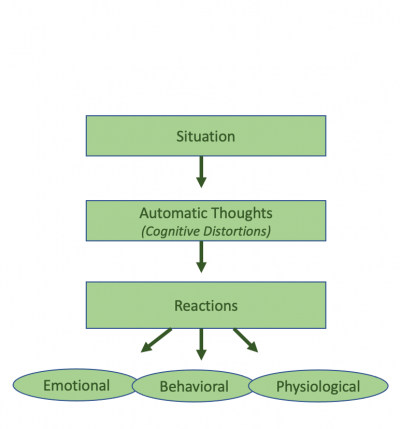CBT is an action-oriented, skill-based type of therapy that is based on the cognitive model. Cognitive model?? Let me explain. We often assume that something happens (a situation or an event) and then we react directly to that situation. You missed a call from your supervisor (situation) and you feel anxious (reaction). But there is a key piece of missing information here. You aren’t feeling anxious because your supervisor called you. You are feeling anxious because of the thoughts you had in response to your supervisor calling you. This might seem like an insignificant distinction but I assure you it is quite significant. Your interpretation of things is an extremely powerful part of this whole process. Take a look at the diagram of the basic cognitive model to the right and then I will explain.